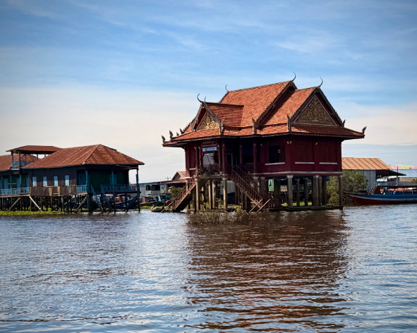 Excursion vers Kampong Pluk, authentique village de pêcheurs construit sur pilotis au bord du lac Tonlé Sap. Vous découvrirez un mode de vie entièrement rythmé par les variations spectaculaires du niveau de l’eau.